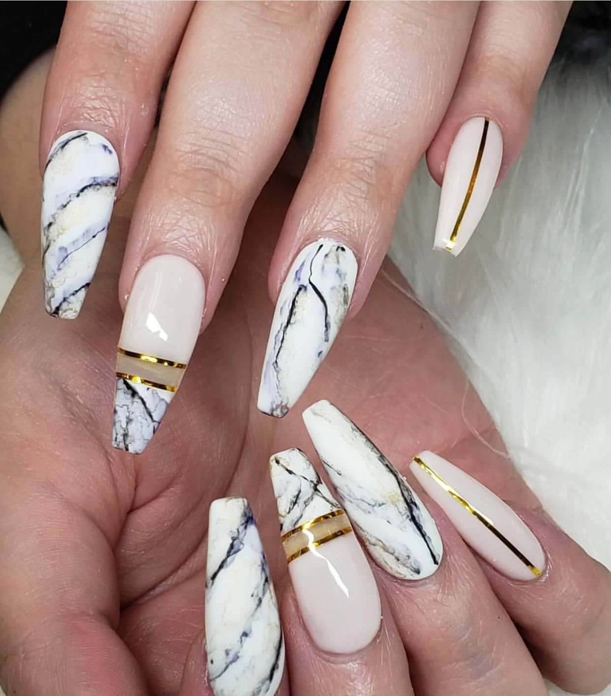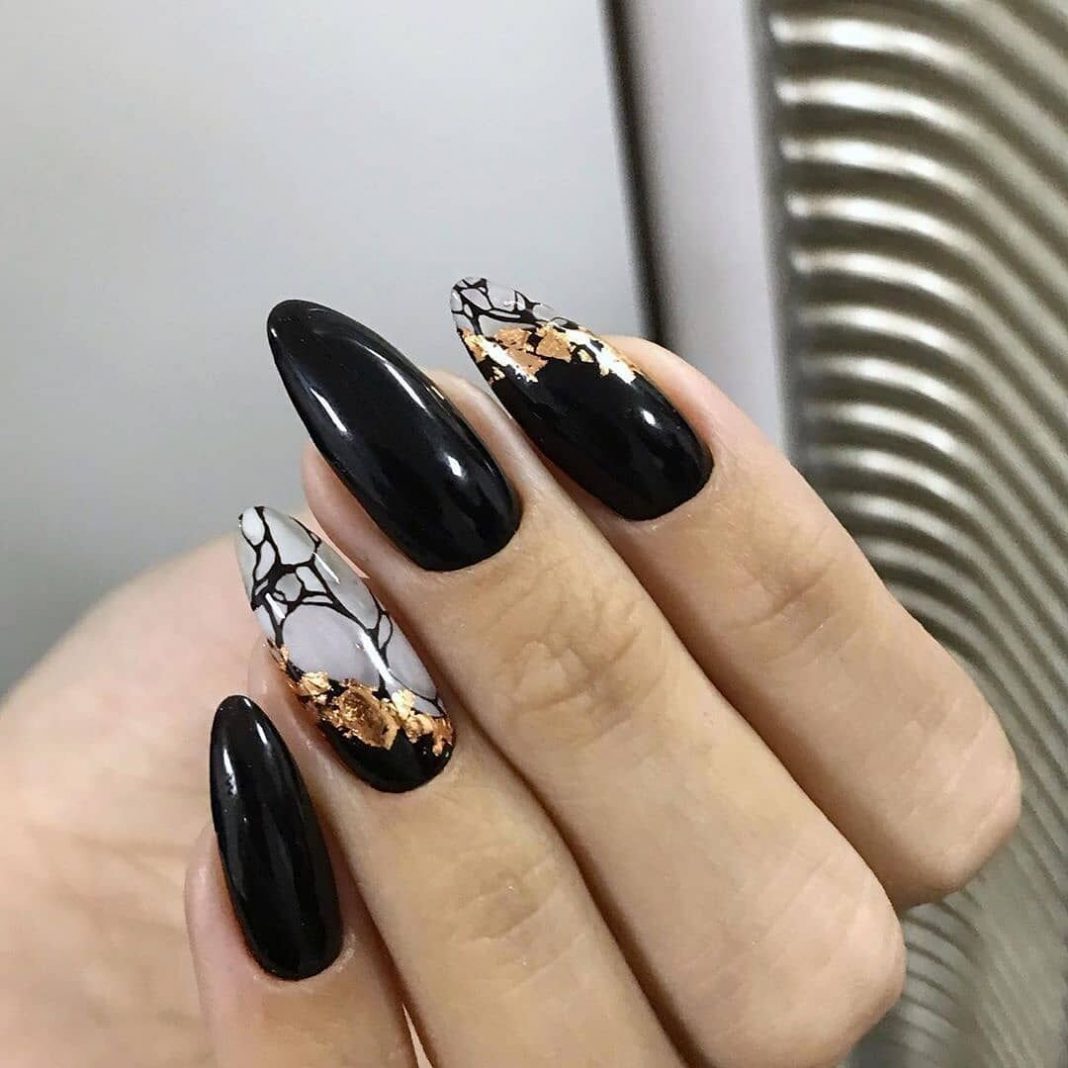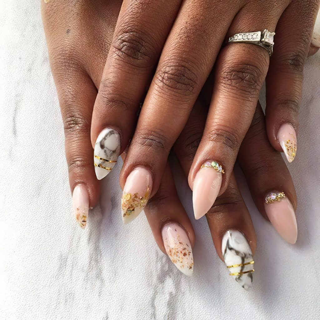 Смешайте золотой лак с другими цветами, чтобы создать мраморный дизайн на кончиках ногтей. Это очень стильно и актуально.