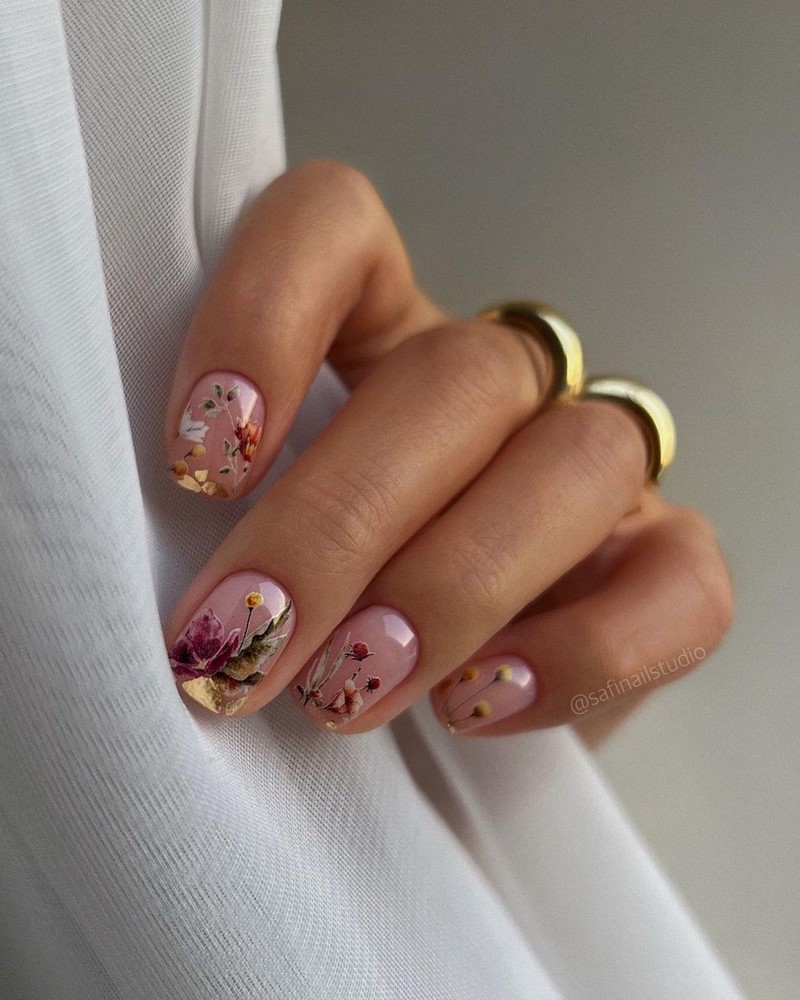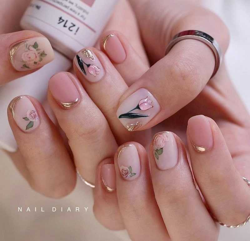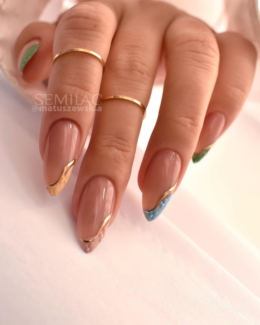Добавьте к золотым кончикам ногтей разноцветные цветы, нарисованные акриловыми красками или выполненные с помощью штампа.