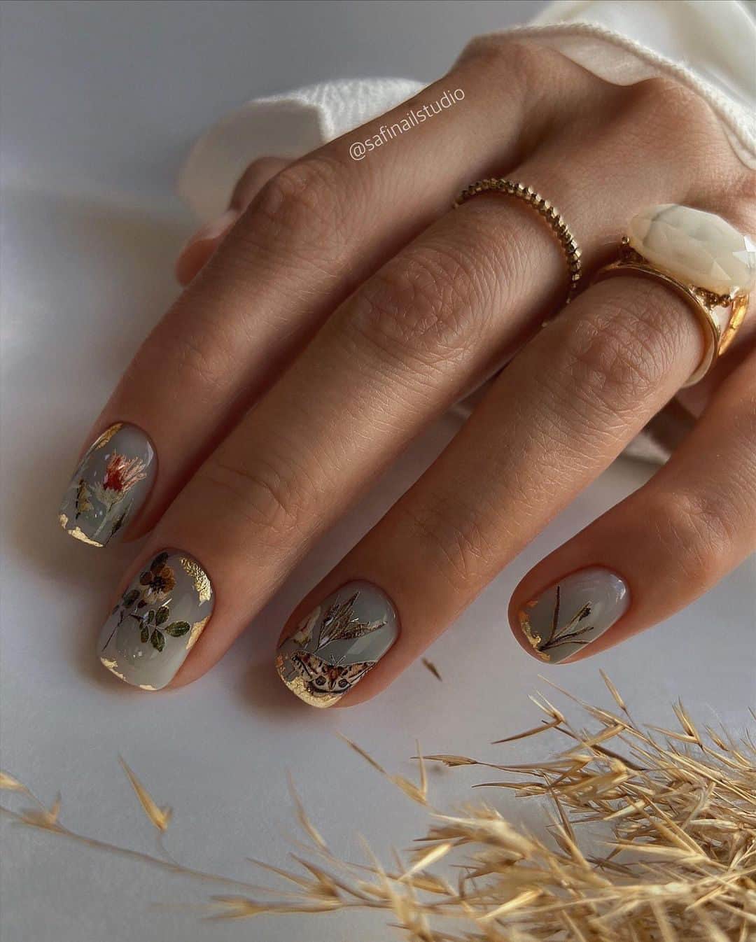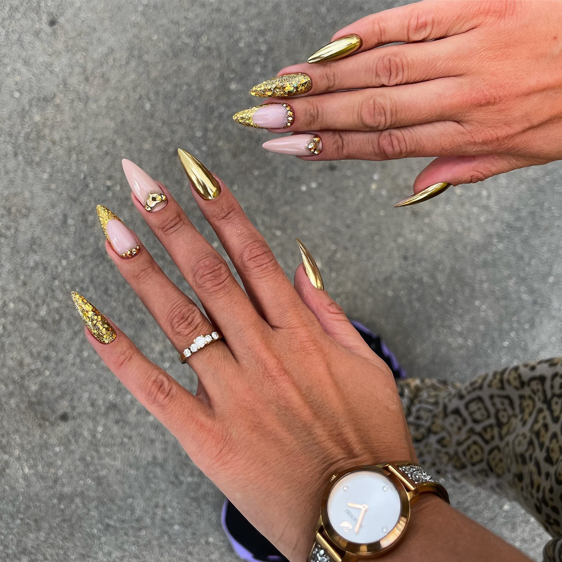 Выберите один или два ногтя на каждой руке, которые будут акцентированы золотыми украшениями, такими как стразы, глиттер, золотые нити или маленькие золотые искусственные камни.