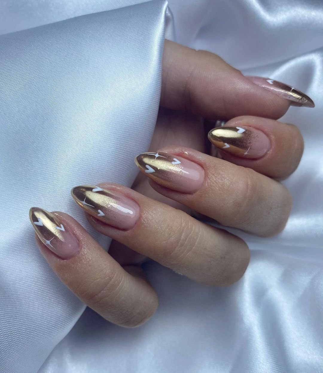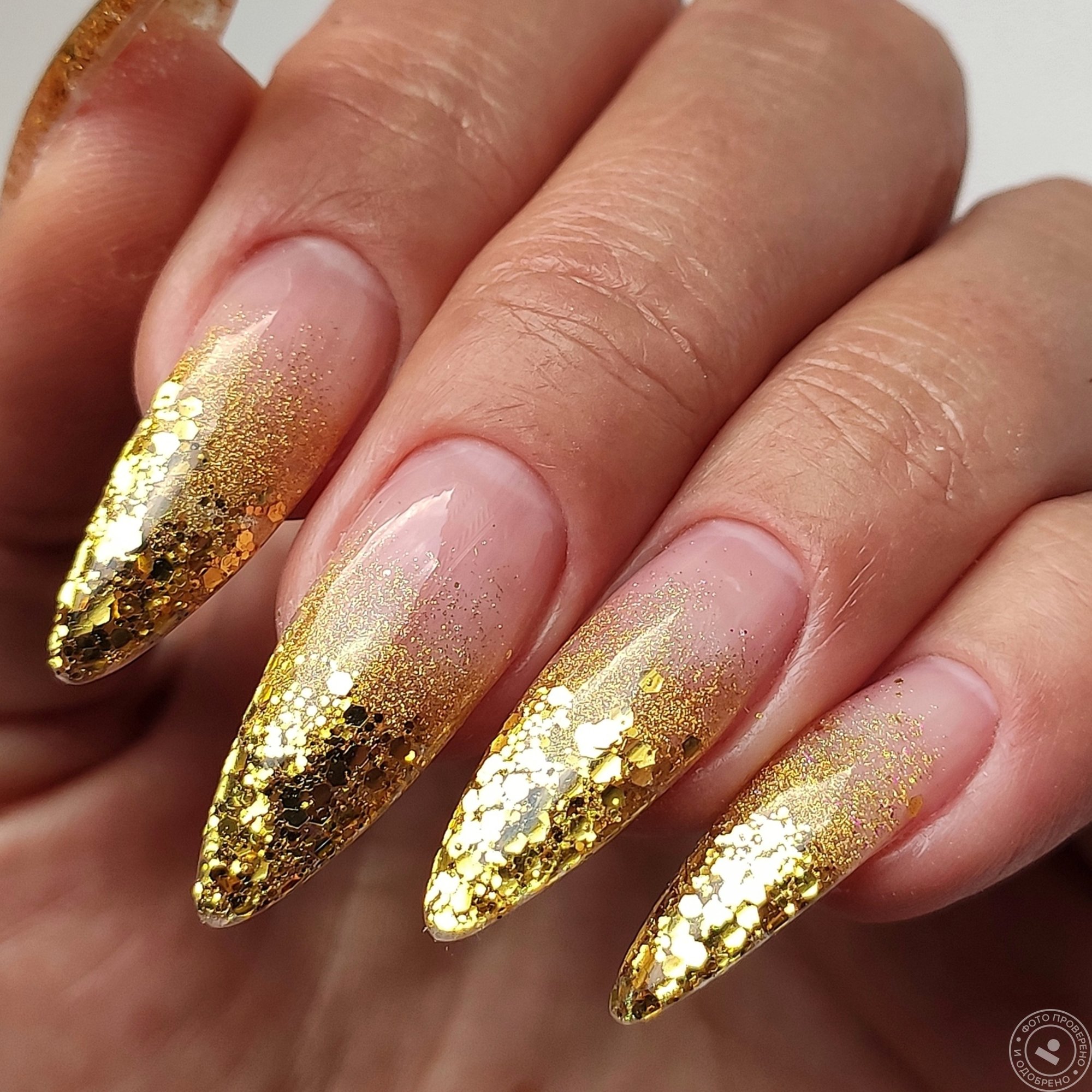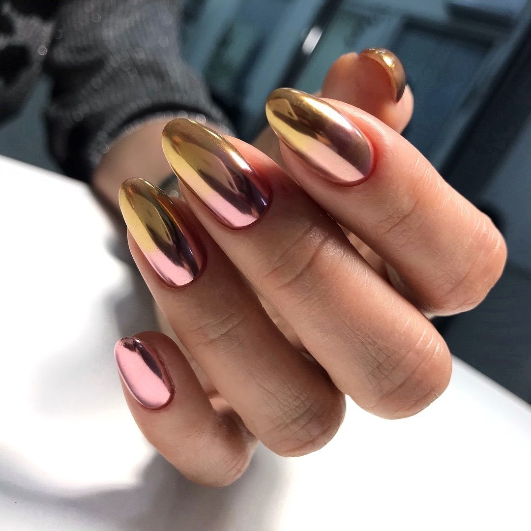 Здесь золотой цвет плавно переходит от кончиков ногтей к середине или основанию ногтя, создавая эффект плавного перехода между двумя оттенками.