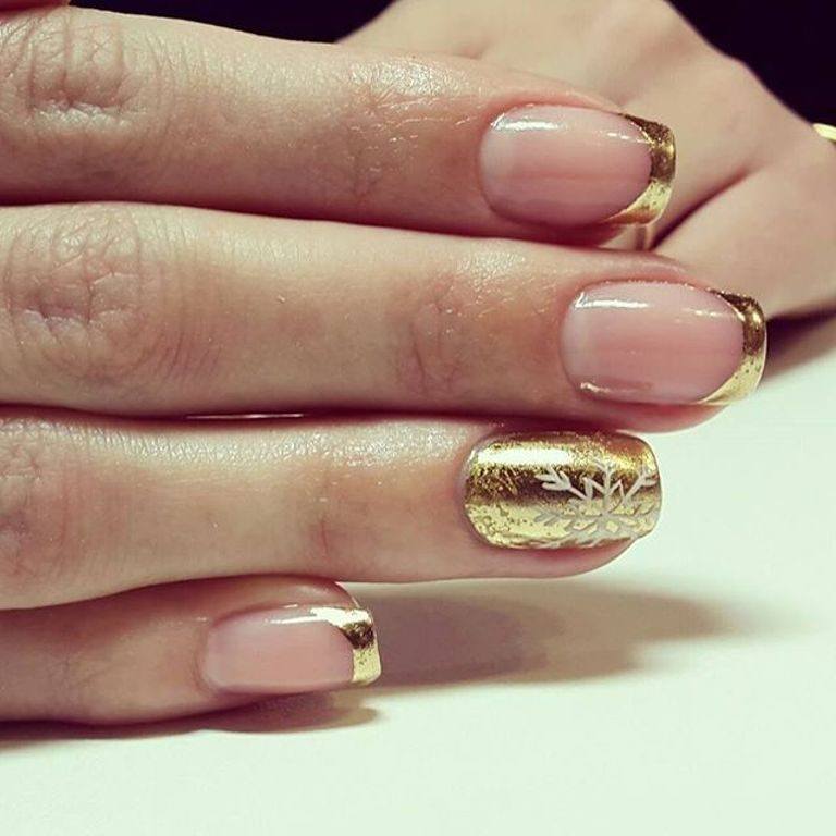 Комбинируйте золотой френч с лунным маникюром, когда лунка у основания ногтя тоже акцентирована золотым цветом.